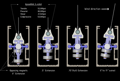 MagRail is the most technologically advanced motorized solar screen of its kind worldwide. Its combination of opposing magnetics & spring tensioning units pivot independently to track the direction and pressure of wind loading forces. By preventing the inner track from binding against the screen fabric, it automatically and silently compensates to guarantee the screen against "blowout" and the continuous failsafe open / close operation under the harshest weather conditions.