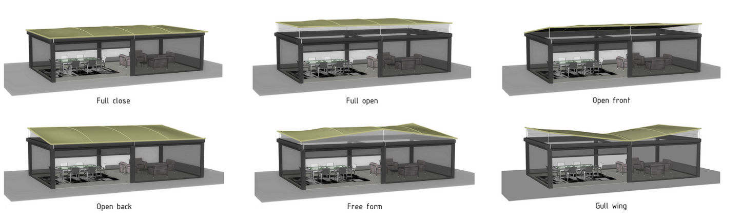 Interlocking leak proof aperture movement type canopy manually or electronically controlled. The electric motor is powered by solar PV cells integrated within the shade panels.